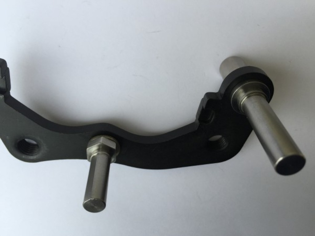 Stainless steel replacemet pins for the 2 piston (on one side) calipers made by Nissin sometimes referred to as type B, used on the rear of most models and front of very early Trophy, Sprint, and Trident models. The used bracket assembly is shown for reference only to help illustrate pin location. Retro, cruiser and some off-road style bikes use a different style of Nissin caliper, sometimes referred to as type D calipers. For these pins see product code B420.