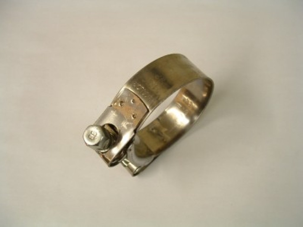 Stainless steel exhaust clamp with internal range from 47mm to 51mm diameter.