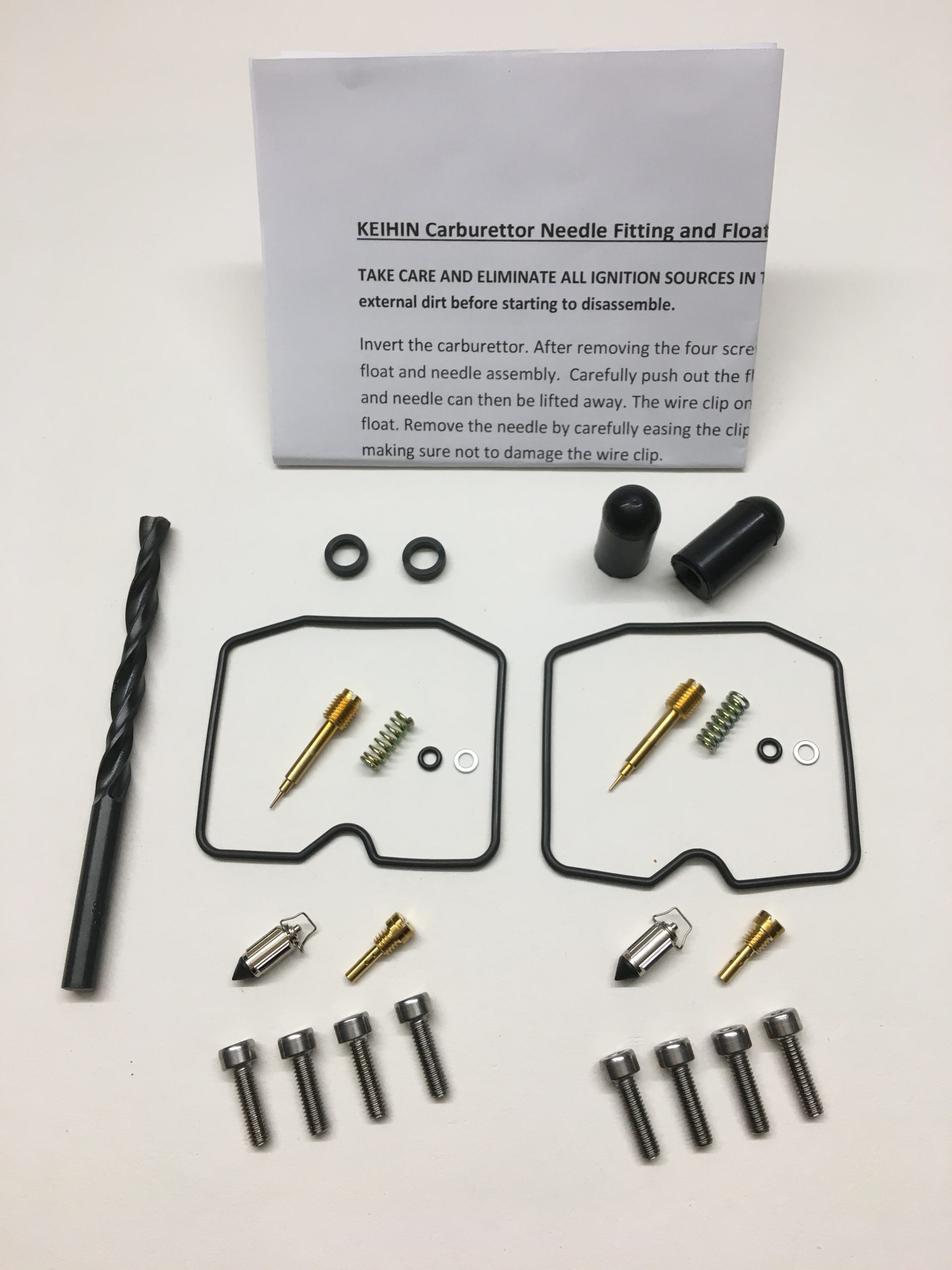 For models fitted with Keihin carburettors. The Keihin rebuild kit for x 2 carburettors with Viton float chamber seals, stainless steel float chamber screws, Viton tipped float needles, pilot jet (both 40 and 42) and pilot air screw assemblies. Kits are available for 2 or 3 carburettors. Fitting instructions included.