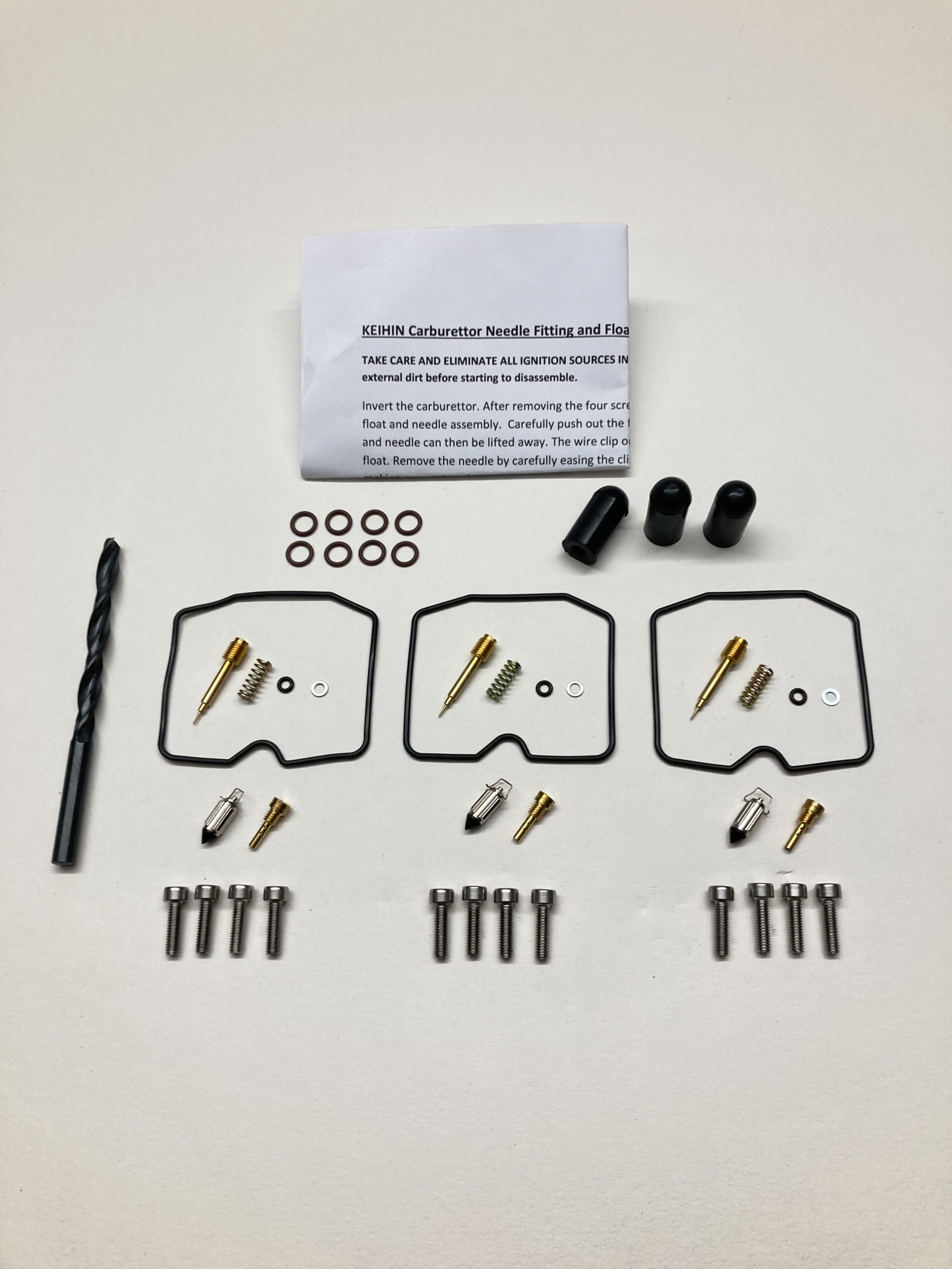 For models fitted with Keihin carburettors. The Keihin rebuild kit for x 3 carburettors with Viton float chamber seals, stainless steel float chamber screws, Viton tipped float needles, pilot jet (both 38 and 40) and pilot air screw assemblies. Kits are available for 2 or 3 carburettors. Fitting instructions included.